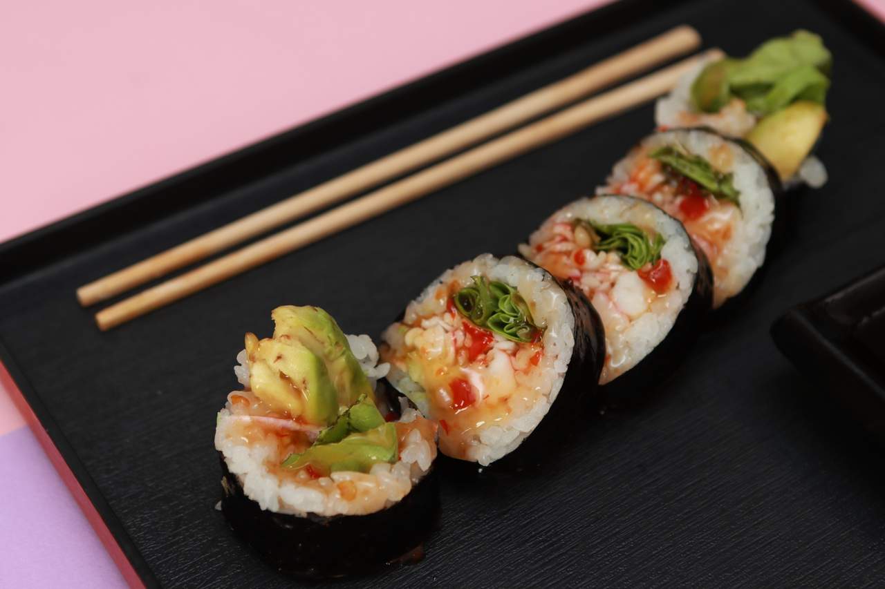 Saumon, rice, nori sheet, avocat, manga, spicy mayo, tempura, panko, sauce crunchy