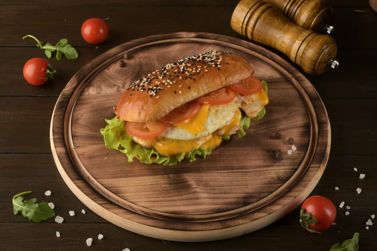 Запашна булка з пшеничного борошна, соковите куряче філе, яйце Пашот, сир Чеддер, помідорка, хрумкий салат, Фірмовий соус