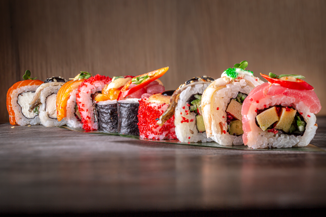 Рис, норі, огірок, Тамаго, японський майонез, ікра Тобіко, авокадо, вугор, соус Унагі, кунжут
