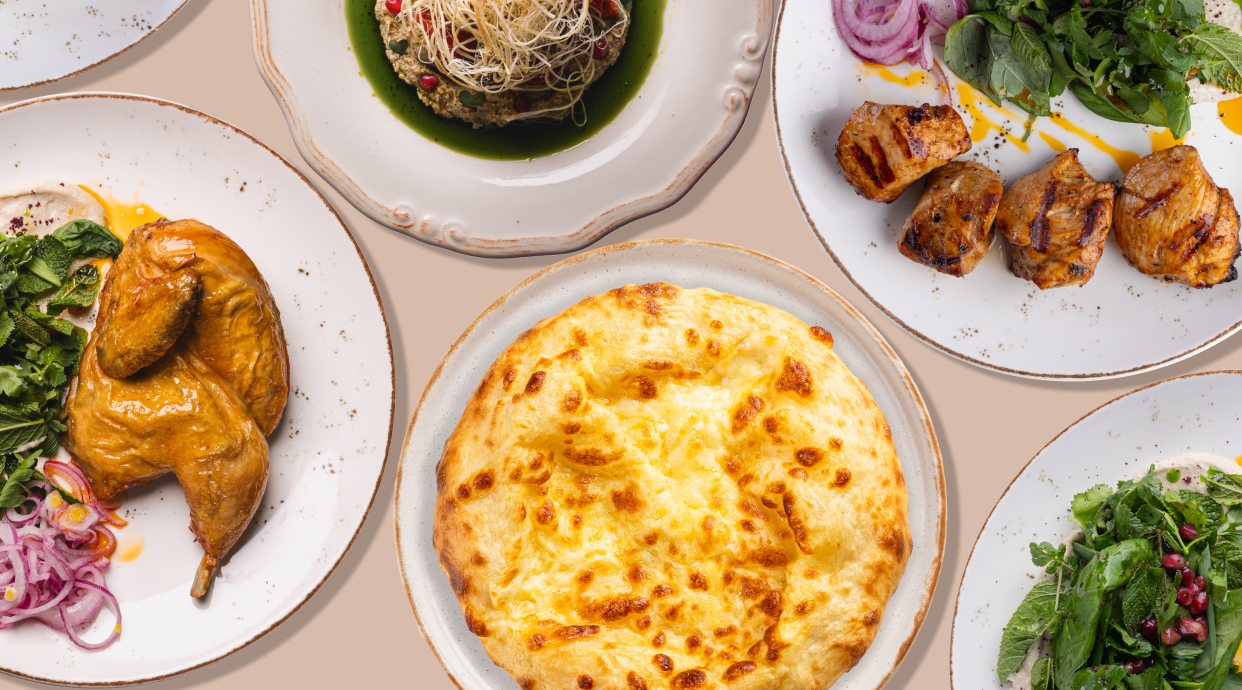 Шашлик зі свинини, шашлик курячий, люля-кебаб з телятини, люля-кебаб з курки, запечена картопля, грузинський лаваш.