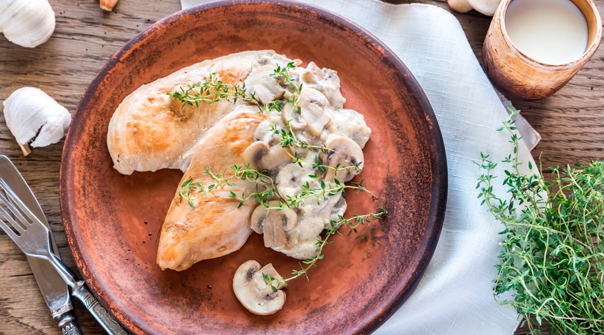 Куряча печінка, печериці, помідор, перець болгарський, мікс салату, часник, лимон
