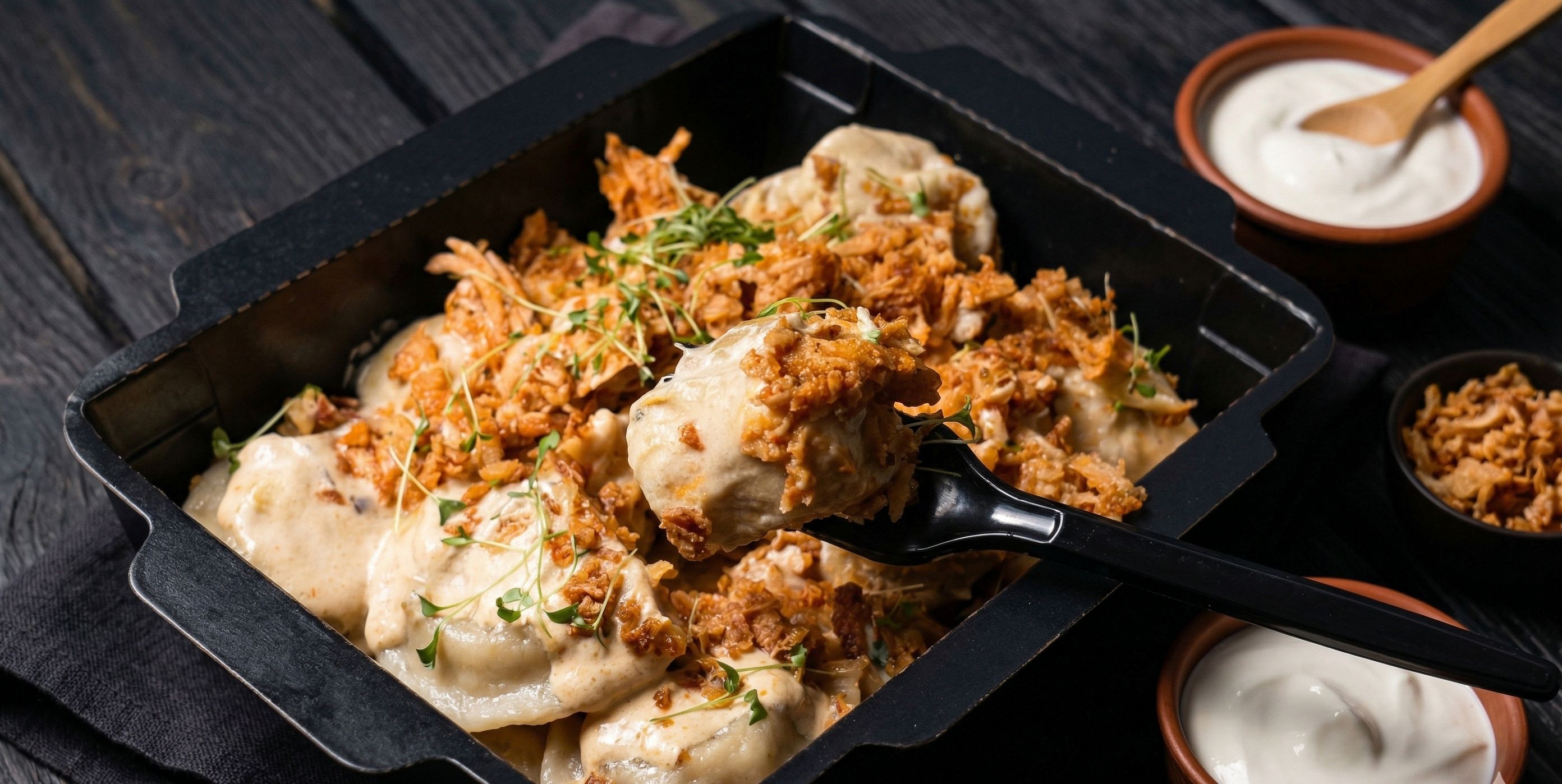 Галушки з індичкою, цибулевими кріспами в вершково-деміглясовому соусі