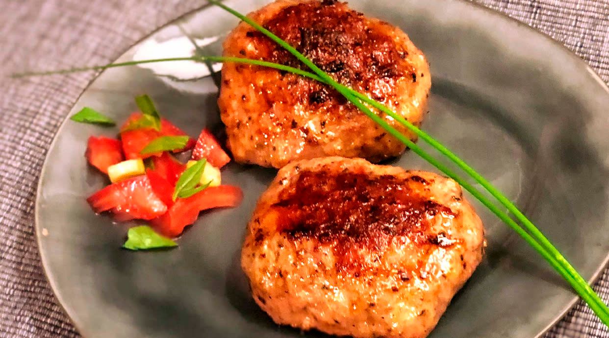 Питка бриош, бургер от пилешко месо, свежа салата и домат, чедър, яйце, карамелизиран лук, гарниран с пържени картофки