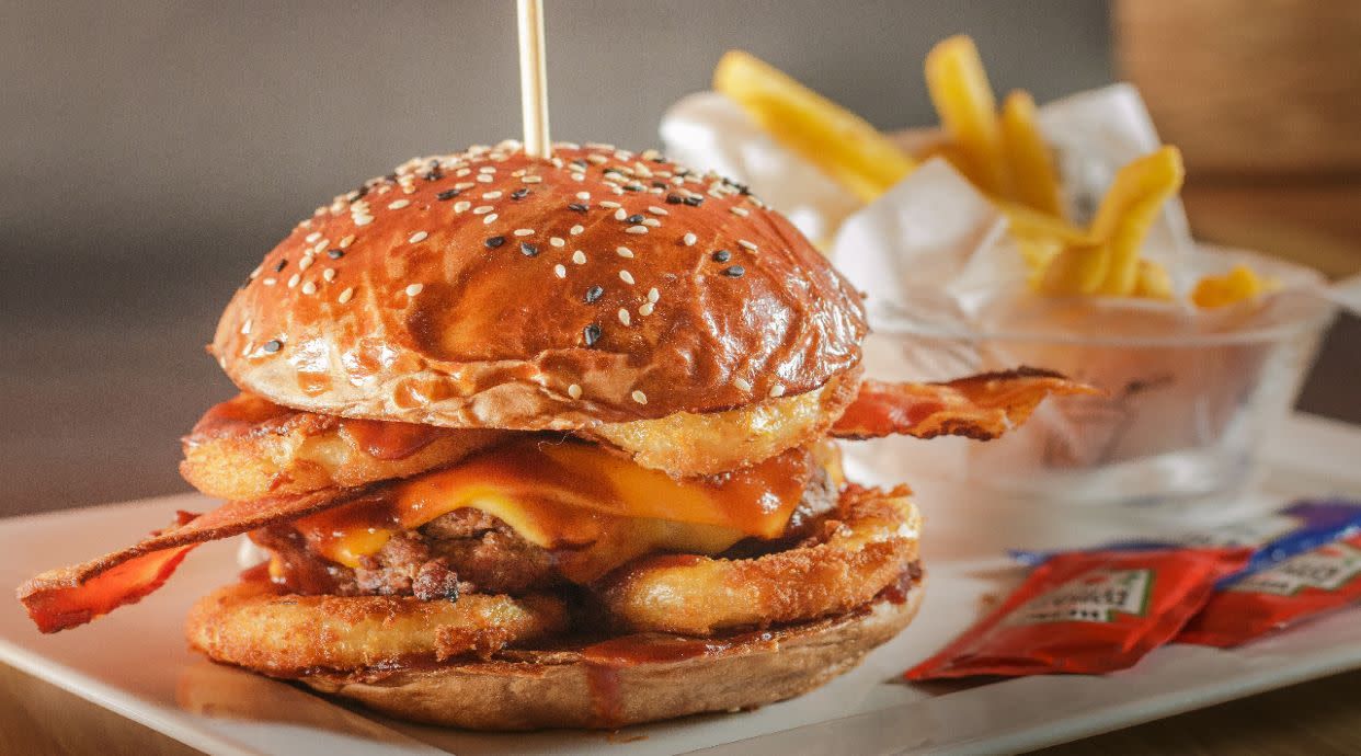 Бриош питка, блек Ангъс кюфте, домат, кисела краставичка, рукола, чедър, карамелизиран лук, сос