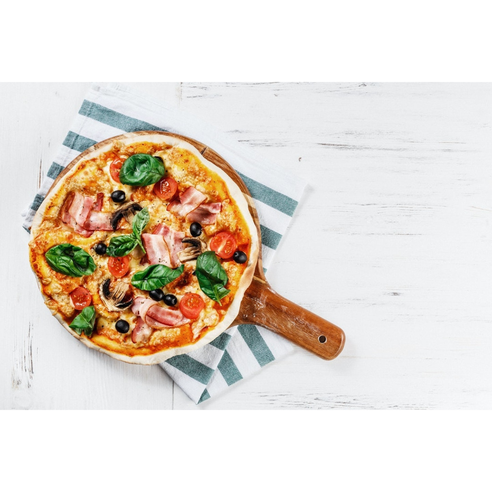 Доматен сос, моцарела, шунка, чоризо, бекон, гъби, маслини, червен лук, пипер, царевица
