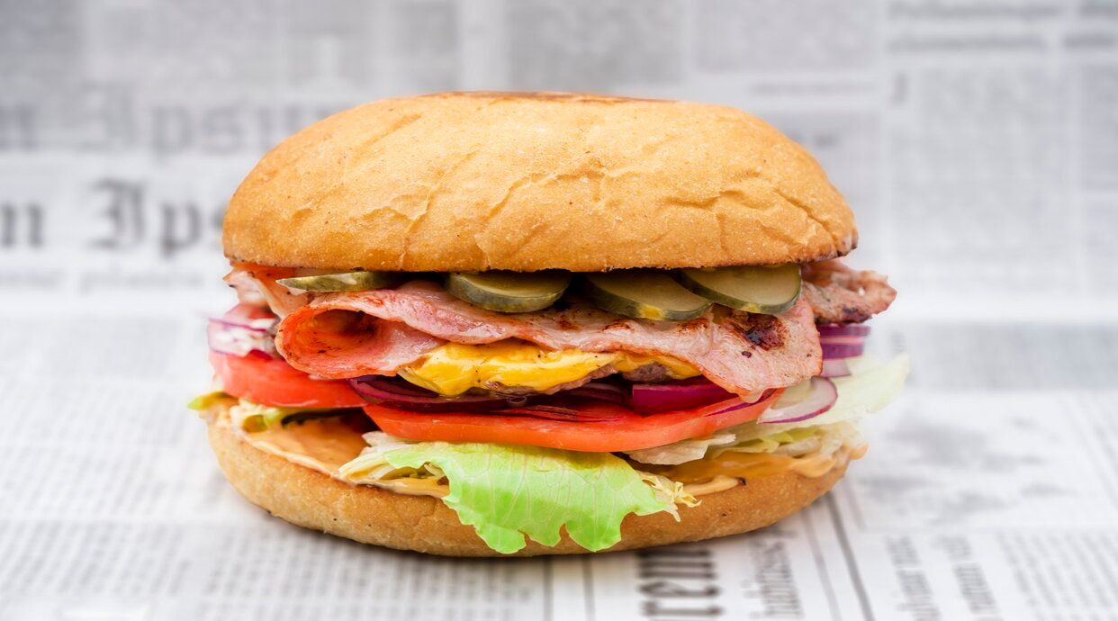 Телешко кюфте - 120 гр, домат, кисела краставица, червен лук, айсберг или маруля, чедър, сос чедър, буртер сос - 450г