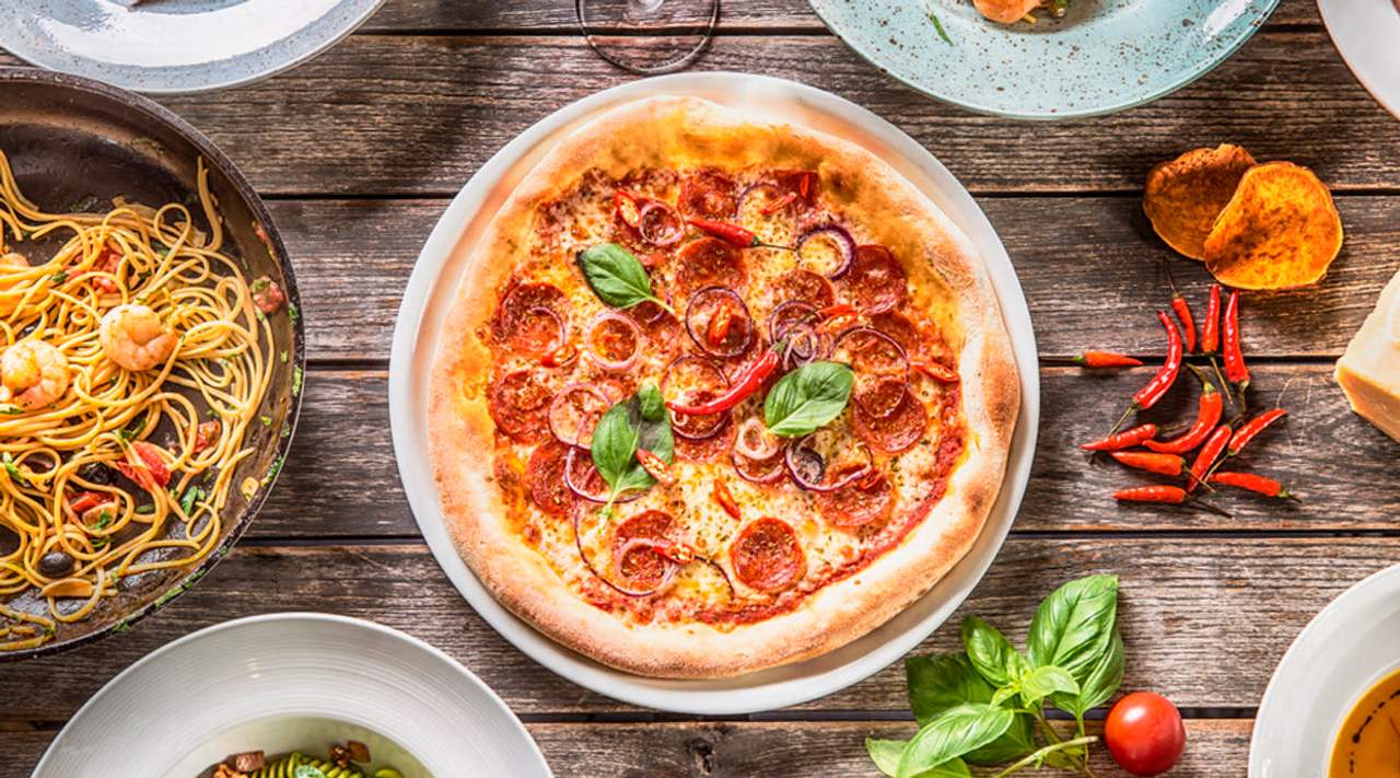 Доматена паста, моцарела пица, шунка, бекон, пилешко, гъби, топено сирене, яйце, чушки, песто дженовезе, риган