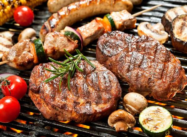 Висменка, телешки кюфтета, домашни наденички, пилешко филе, печени зеленчуци с чесън и риган