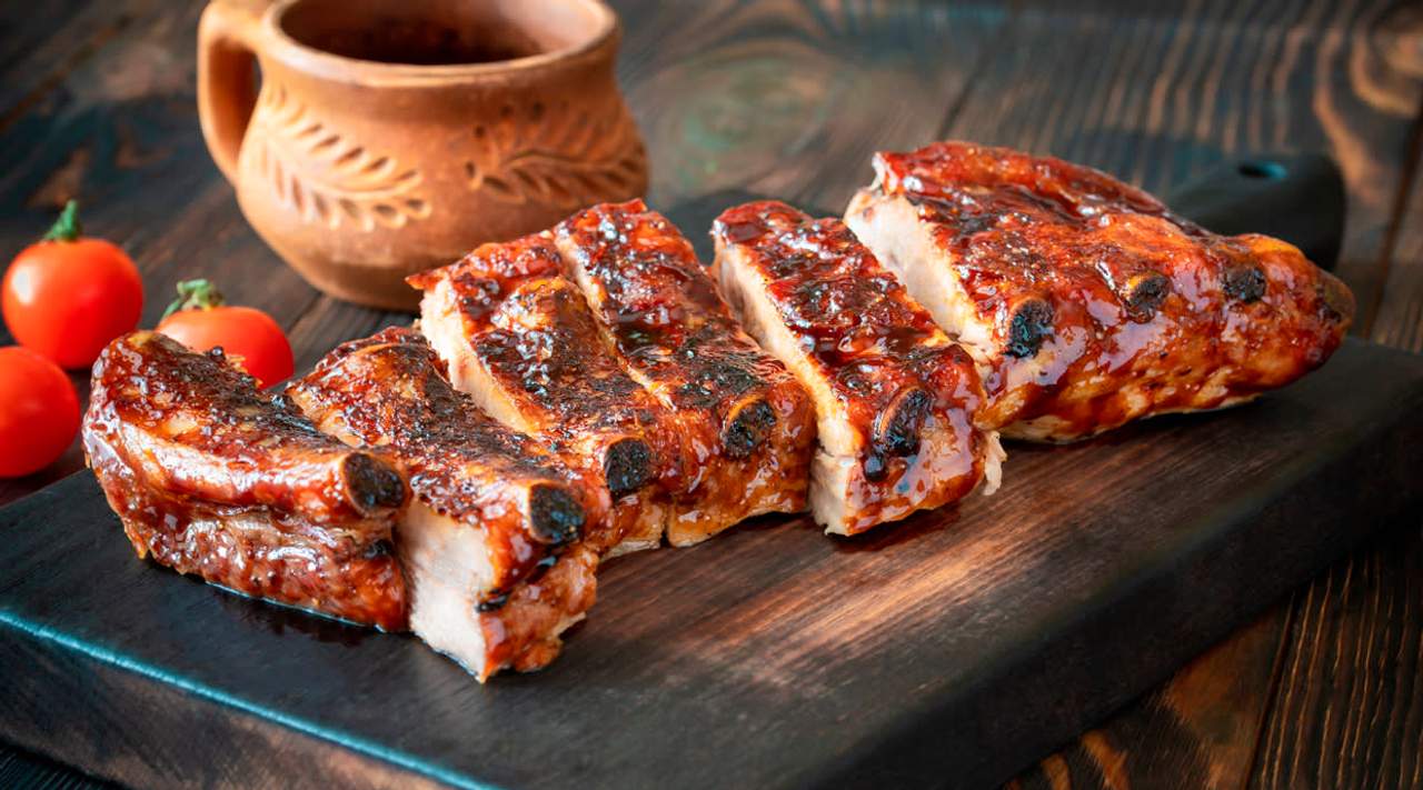 Лепкави свински ребра с хрупкави пресни картофки с билки и грилована млечна царевица, поръсени с цветен сусам пресен лук