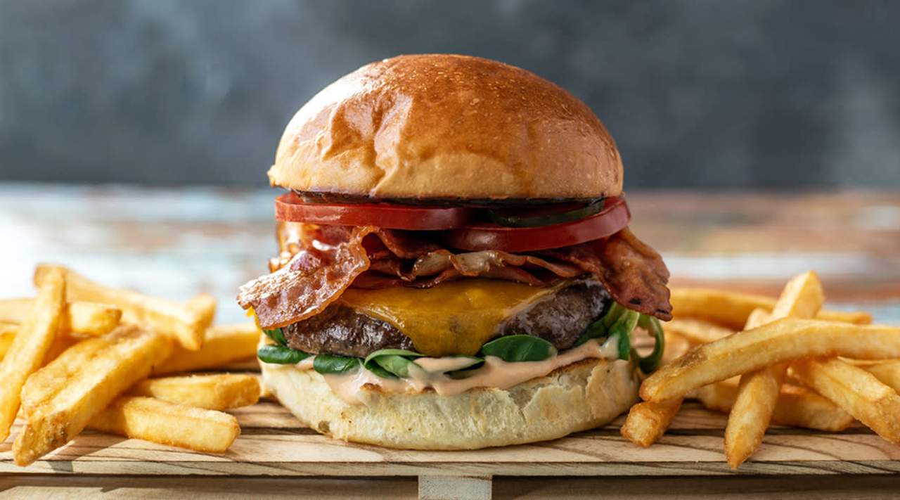 Телешко бургер (2бр), слайс чедър (2бр), бекон, айсберг, домат, лук, пържени картофи, чеснов сос