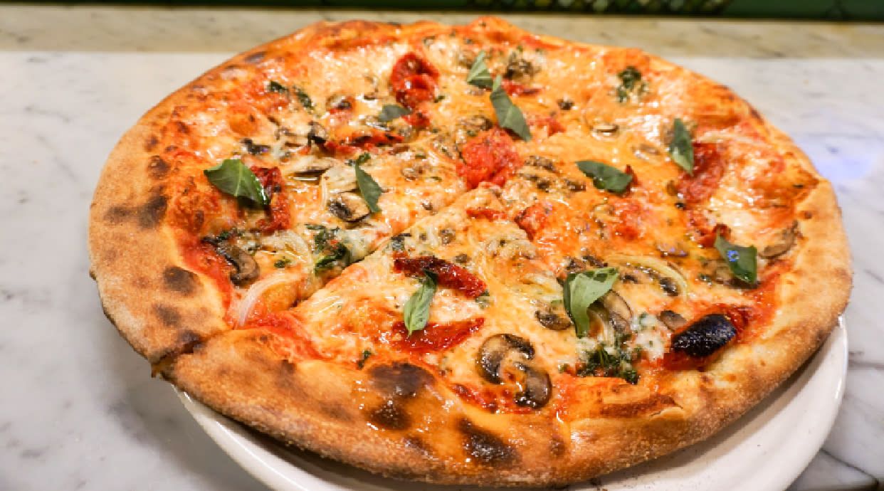 Белени домати, салатна моцарела, орехи, босилек, сос песто