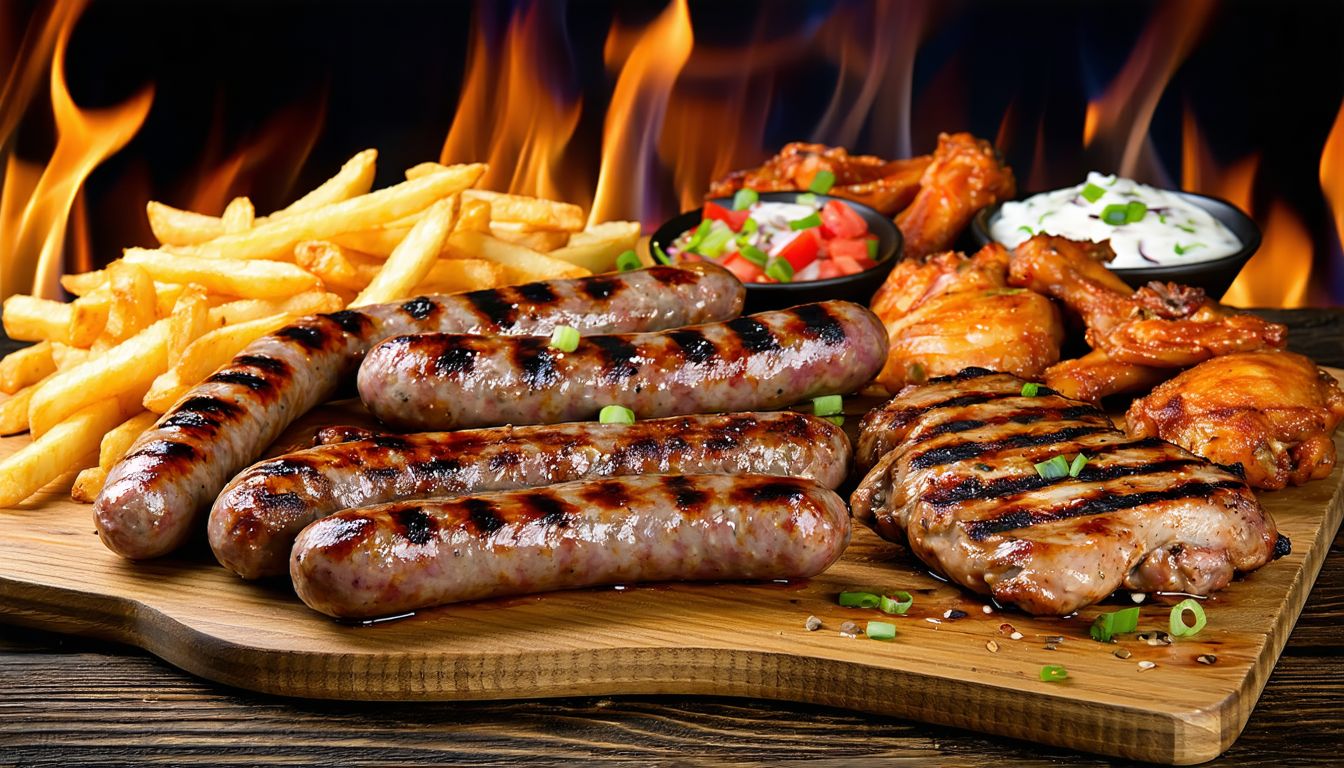 ~ 1 кг. /пърленка, свинско филе, бекон, свински ребра, суджук, люта чушка, сос, домати, краставици/