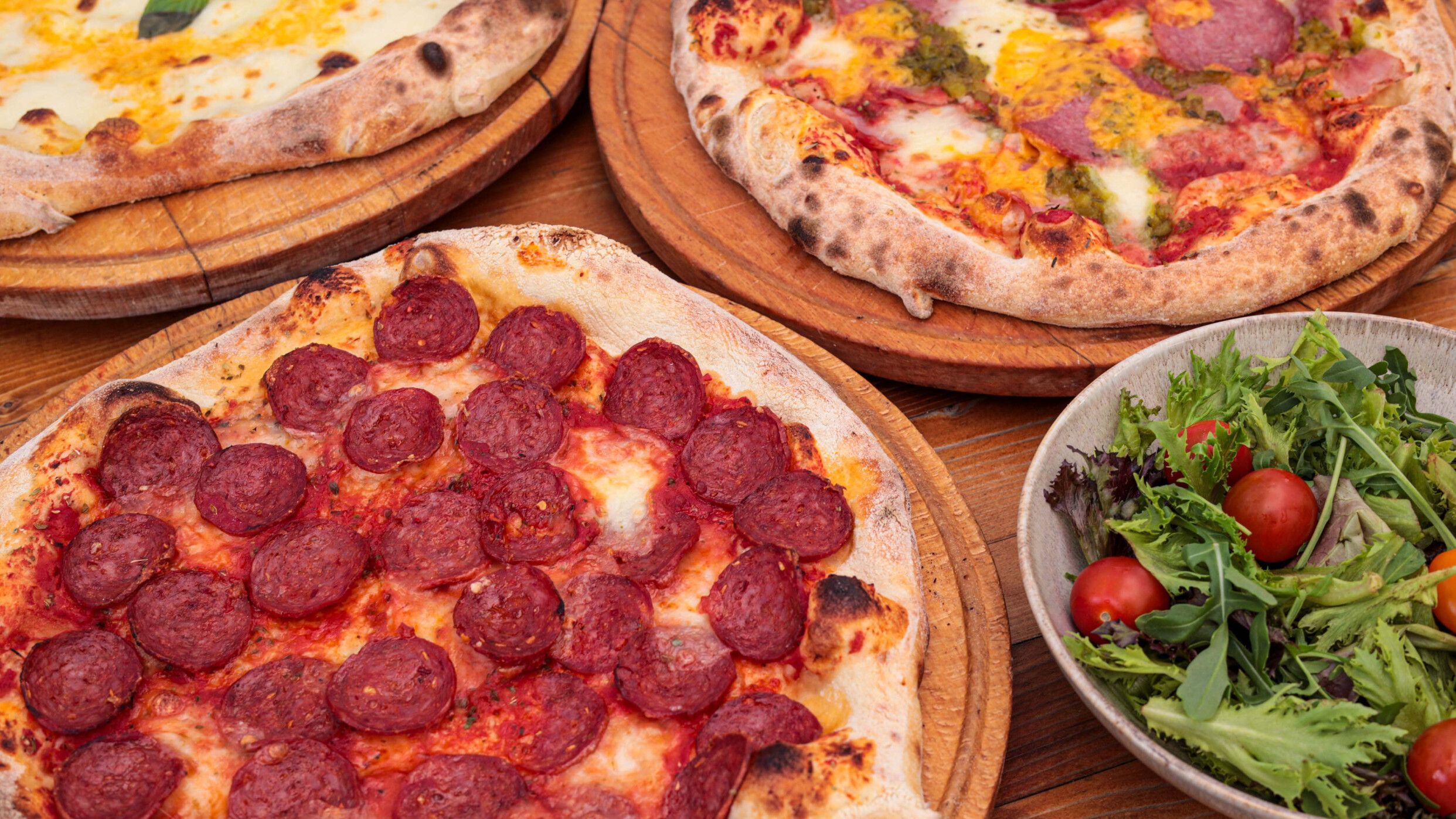 Доматен сос, моцарела, пилешко филе, салам милано, прошуто кото, прошуто крудо