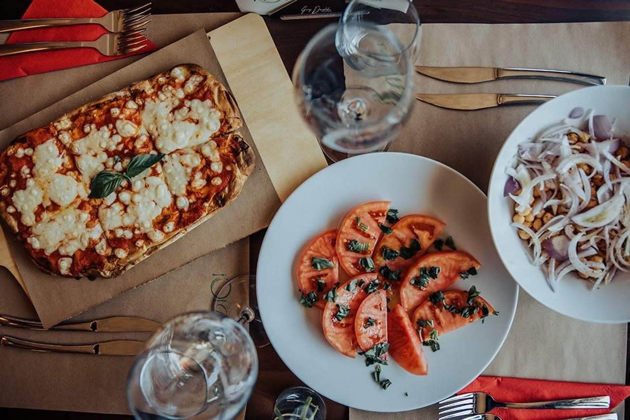 Пинса с доматен сос, моцатрела Фиор ди Лате, лют салам