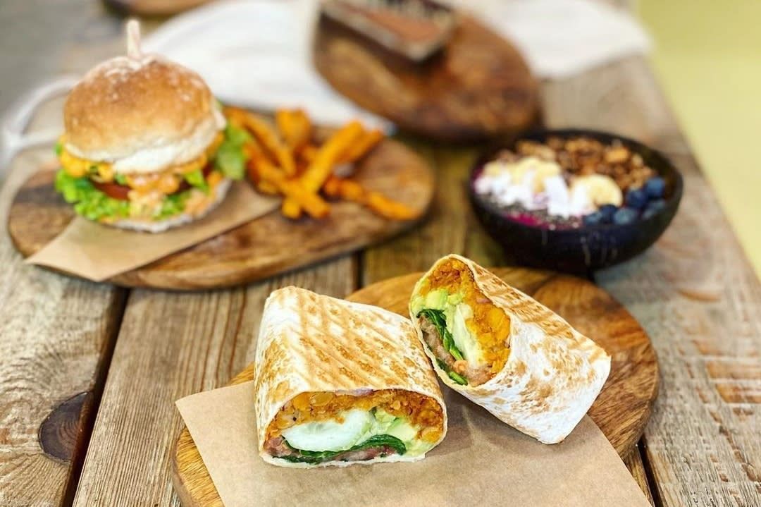 Домашна безглутенова питка, кюфтенце от киноа, черен боб, бадеми, конопено семе, червени чушки, хранителна мая, подправки, домат, кълнове, червен лук, веган майонеза и мека горчица