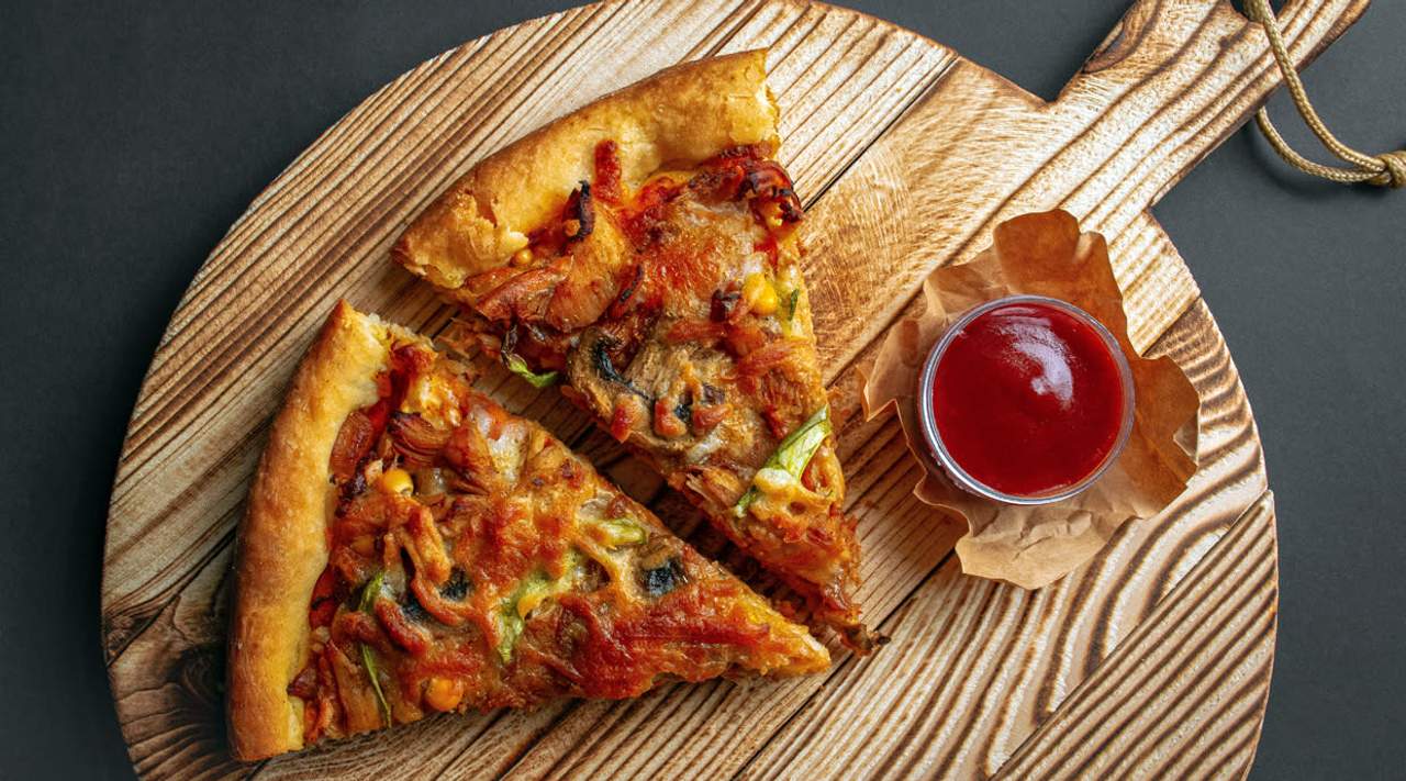 Доматен сос, моцарела, пилешка шунка, царевица, риган