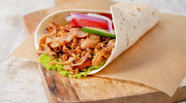 Питка лаваш, Пилешко месо, картофи, домати, кисели краставички и чеснов сос
