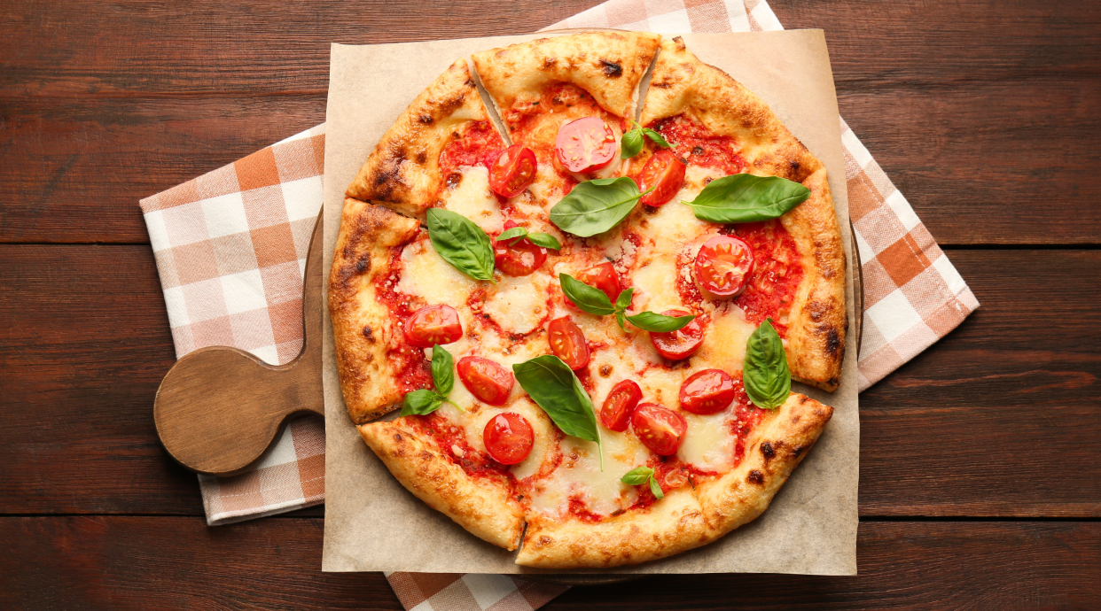 Доматен сос, прясна моцарела, босилек. Tomato sauce, fresh mozzarella, basil.