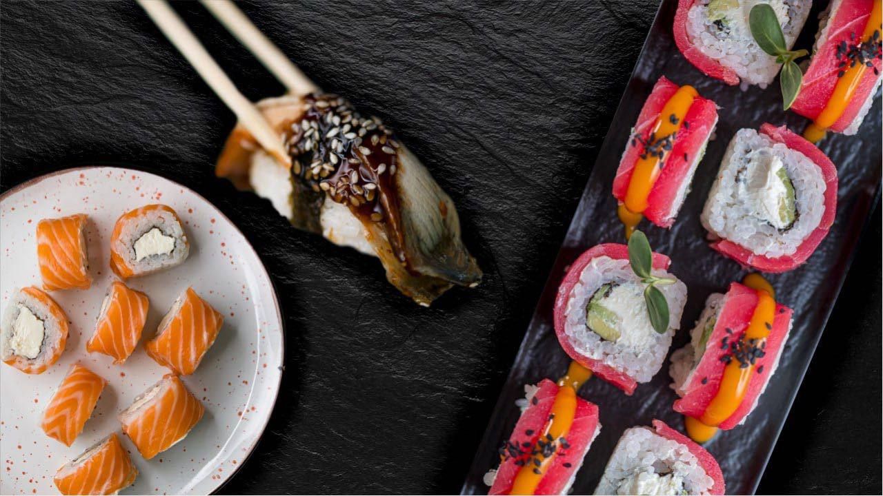 Изискано съчетание на вкусове и текстури: водорасли нори, ориз, снежен рак, сирене Филаделфия, авокадо, леко осолена сьомга, майонеза, черен сусам, скарида в панировка, масаго, сусам, зелен лук, пържена сьомга, топено сирене, домат, краставица, пикантен сос, омлет, стриден сос, терияки, бадемови стърготини