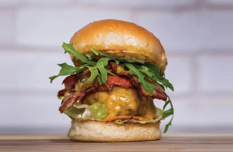 Бриош питка, сос айоли, айсберг, кисели краставички, домат, телешки бургер, чедър, мармалад от бекон, картофен крокет