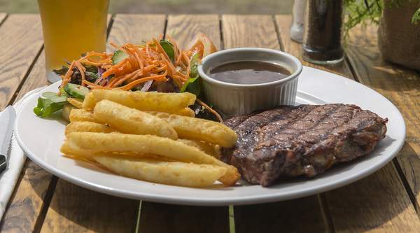 10 бр. прясно изпечени кебапчета на скара, салата зеле с моркови, овкусена с дресинг, порция пържени картофки и домашна едросмляна лютеничка