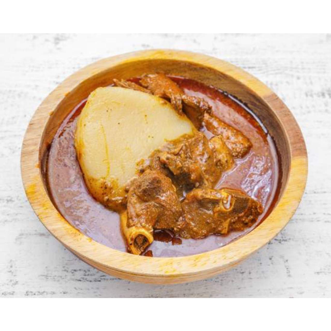 Foutou sauce claire, poisson fumé et tête de bœuf