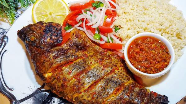 Attiéké avec condiment et deux poissons thon
