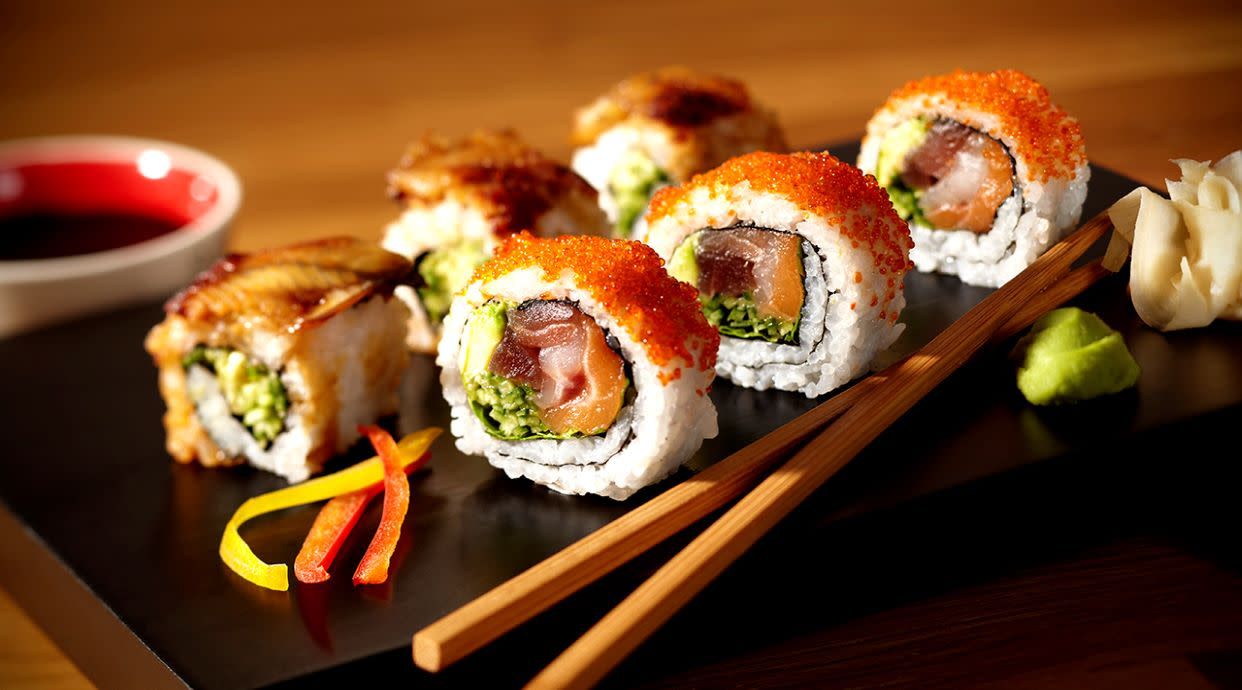 Salmón flameado con mayonesa japo, langostino tempurizado, aguacate, negi e ikura