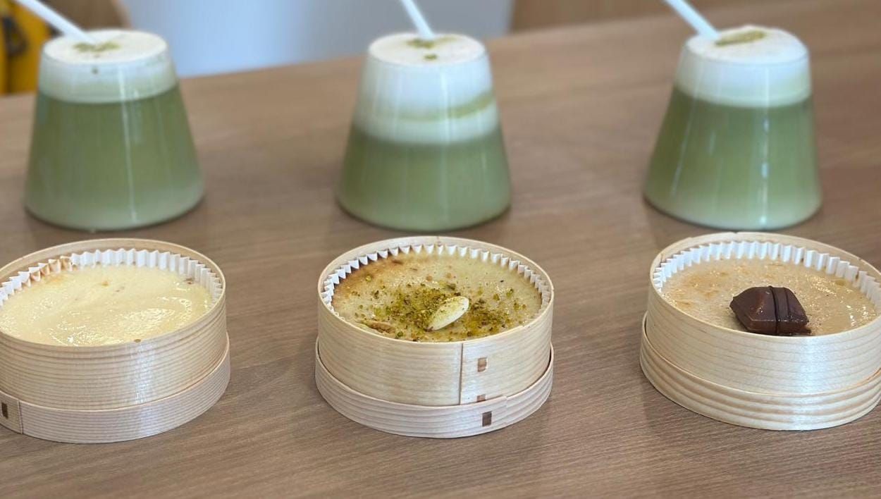 Matcha tradicional con coulis de fruta de la pasión y mango