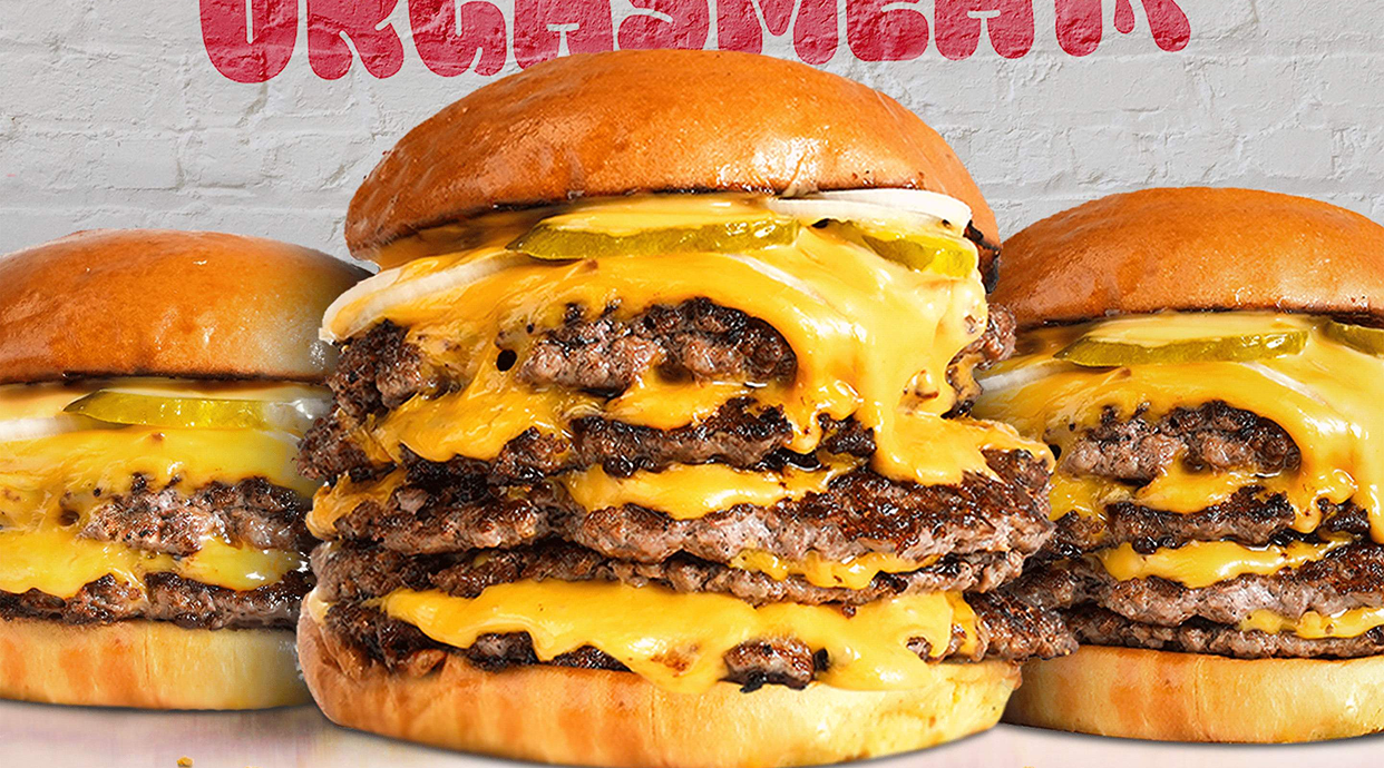 Pan brioche, CINCO smash burgers, cinco lonchas de cheddar, salsa de la casa, cebolla y pepinillos