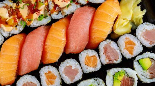 Uramaki rollo tigre (8 pzs.), Uramaki rollo ángel (8 pzs.), nigiri atún (2 pzs.), nigiri salmón (2 pzs.)