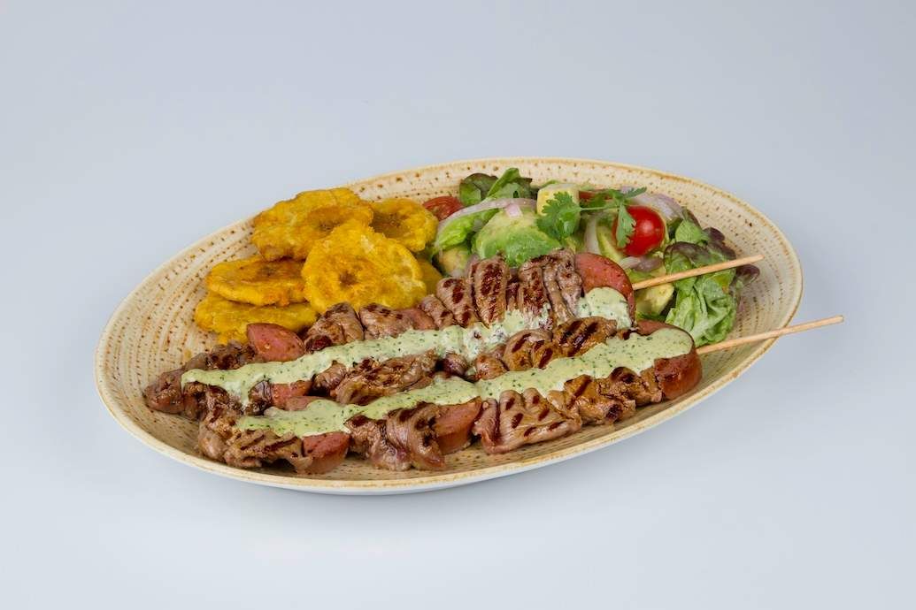Servido con patacones, arroz blanco y ensalada de aguacate