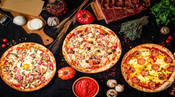 Base de tomate, mozzarella fiordilatte, queso brie, champiñones y aceite de albahaca