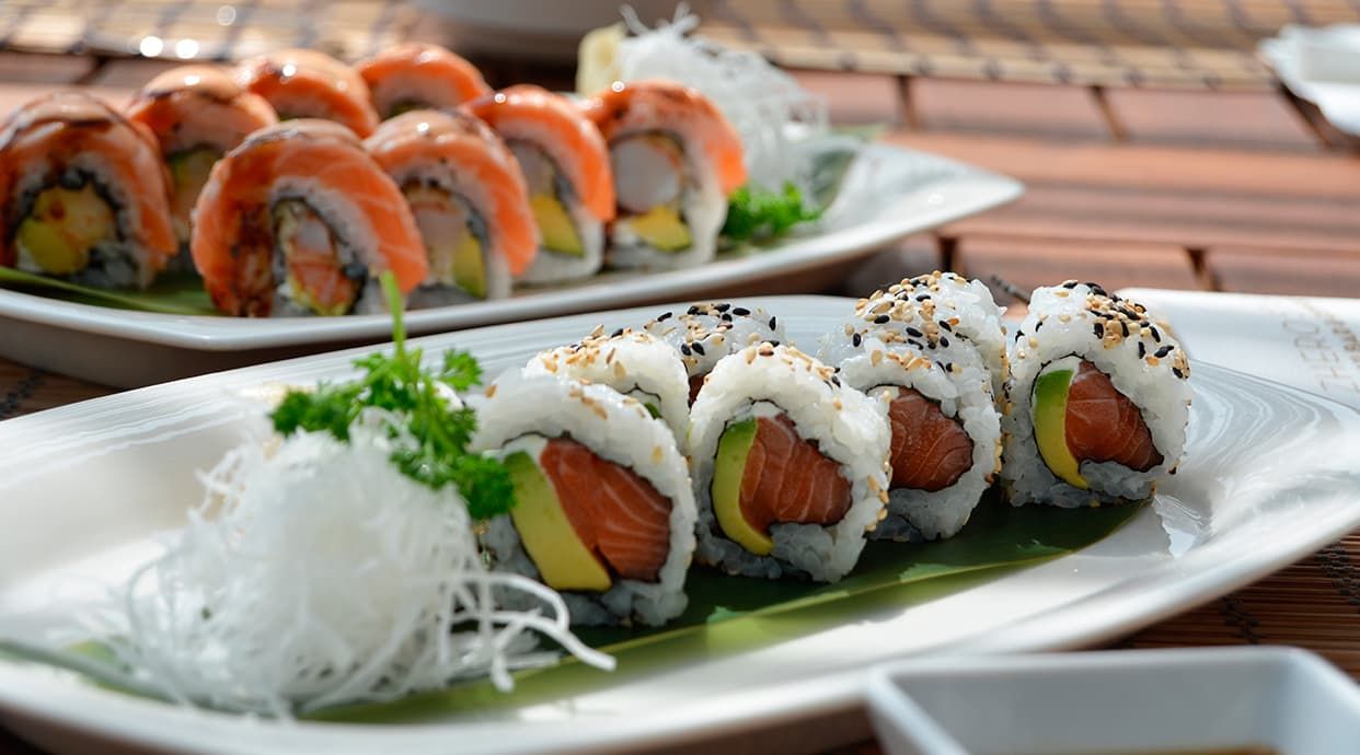 Sushi salmón (2 uds), sushi atún + sushi pescado blanco variado (3 uds) + California roll (4 uds), maki atún (4 uds) + aguacate roll (4 uds). Contiene crustáceos y pescado