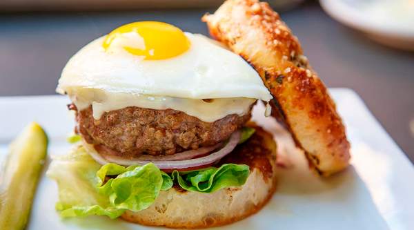 Carne de vacuno, lechuga, tomate, cebolla, bacon y huevo frito