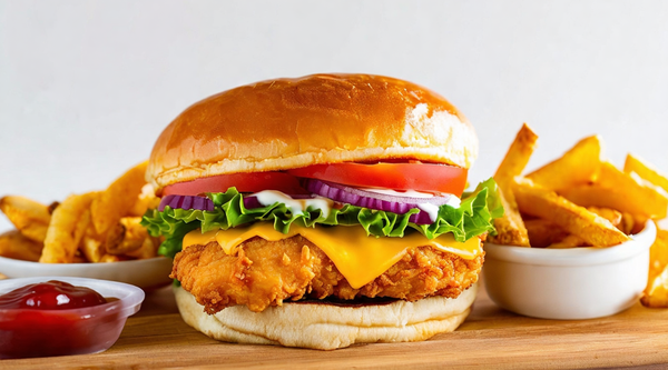 Pollo crujiente, mayonesa de albahaca, queso y tomate seco. Con guarnición de patatas fritas.