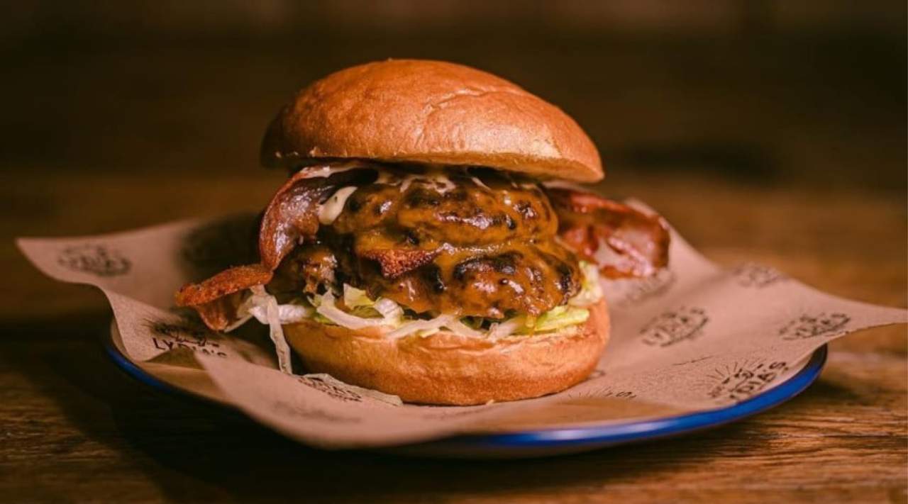 Doble carne picada (90g.) con doble de queso cheddar, pepinillo, lechuga, cebolla al natural, bacon y salsa bbq de café