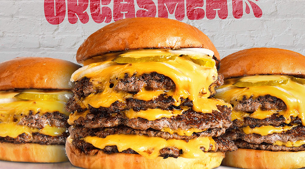 Pan brioche, CINCO smash burgers, cinco lonchas de cheddar, salsa de la casa, cebolla y pepinillos