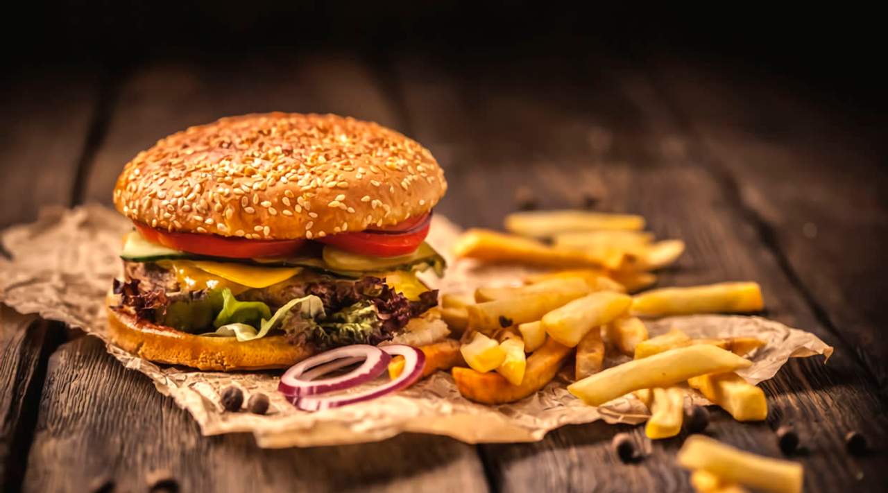 Lechuga, tomate, queso cheddar, anillos cebolla, salsa anoia