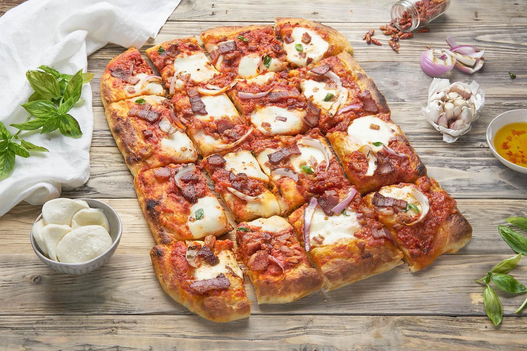 Salsa de tomate, mozzarella, bacon, carne picada de ternera 100%, salsa BBQ, cebolla frita.