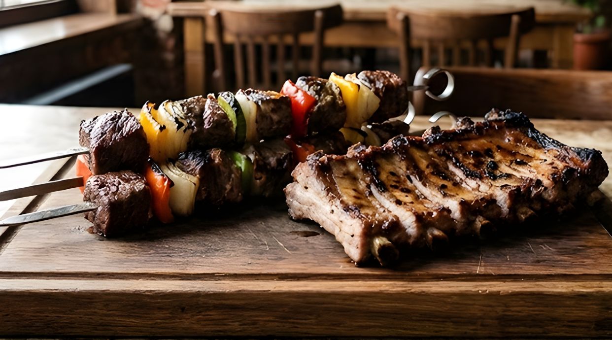 Brochetas de carne a la parrilla (2 uds.) y Arroz