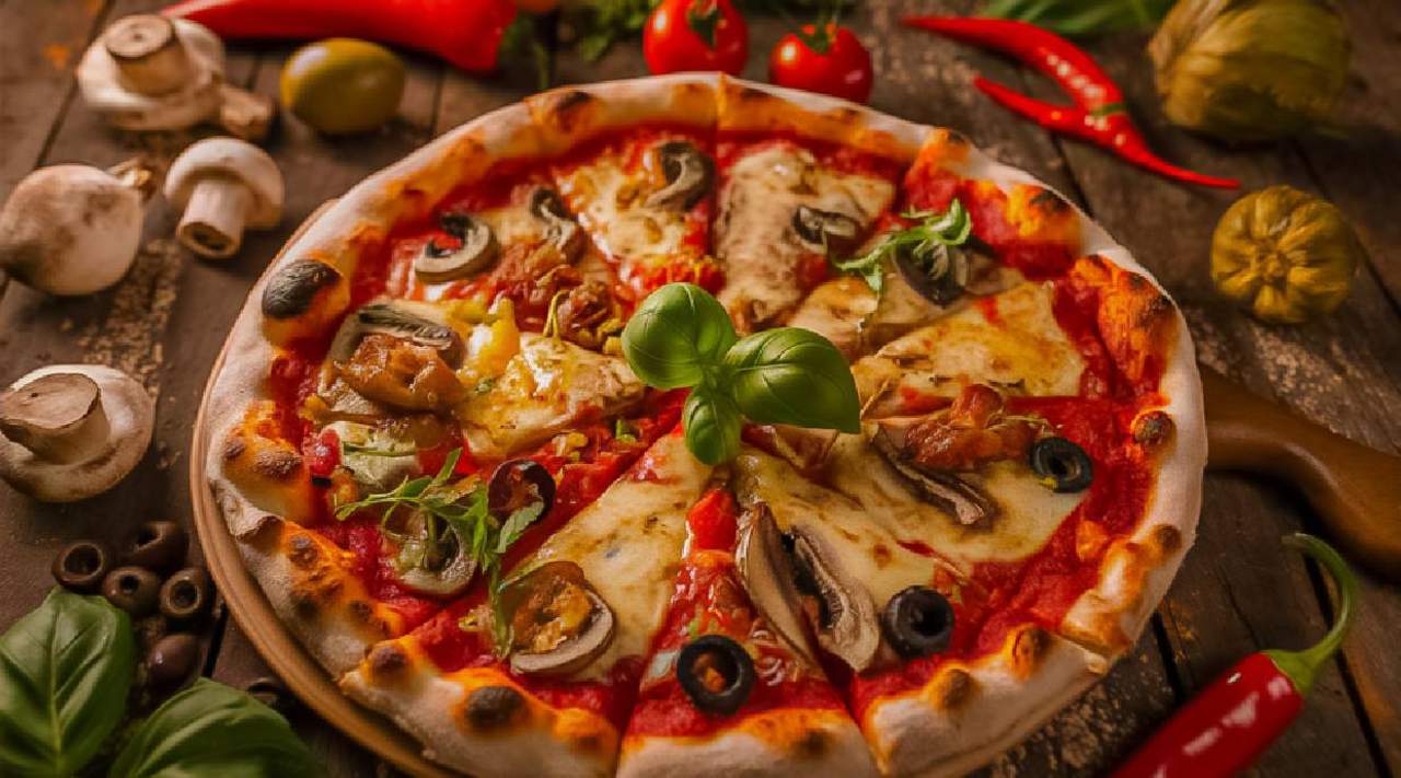 Jamón cocido, setas, aceitunas, alcachofas, salsa de tomate, mozzarella y orégano