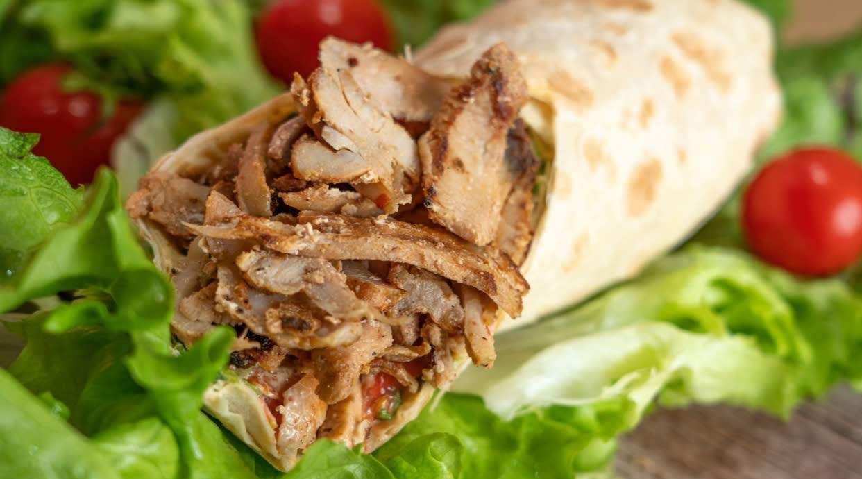 Tortilla fina en rollo con carne de pollo, ternera o mixto, acompañado con lechuga, tomate, cebolla, col lombarda, zanahoria, salsa finas hierbas y salsa picante.