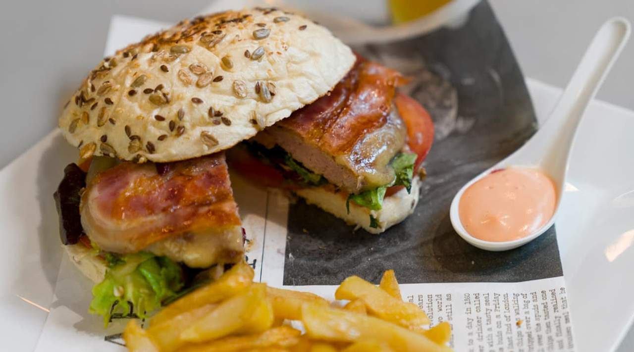 Buey, tomate natural, cebolla morada, mezclum, queso havarti fundido, bacon ahumado, reducción de vino y mayonesa