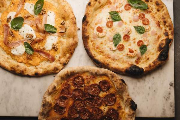 Chorizo de Arrieta, fior di latte, nuestra masa secreta con bitxiki y peperoncino, (el picante rey de Italy) con aceite de albahaca de huerta.