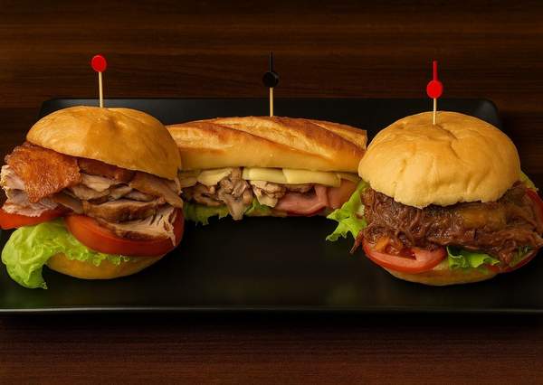 Pan baguette, vegetales, jamón york (60 g.), pierna asada (60 g.), queso gouda (60 g.) y patatas fritas