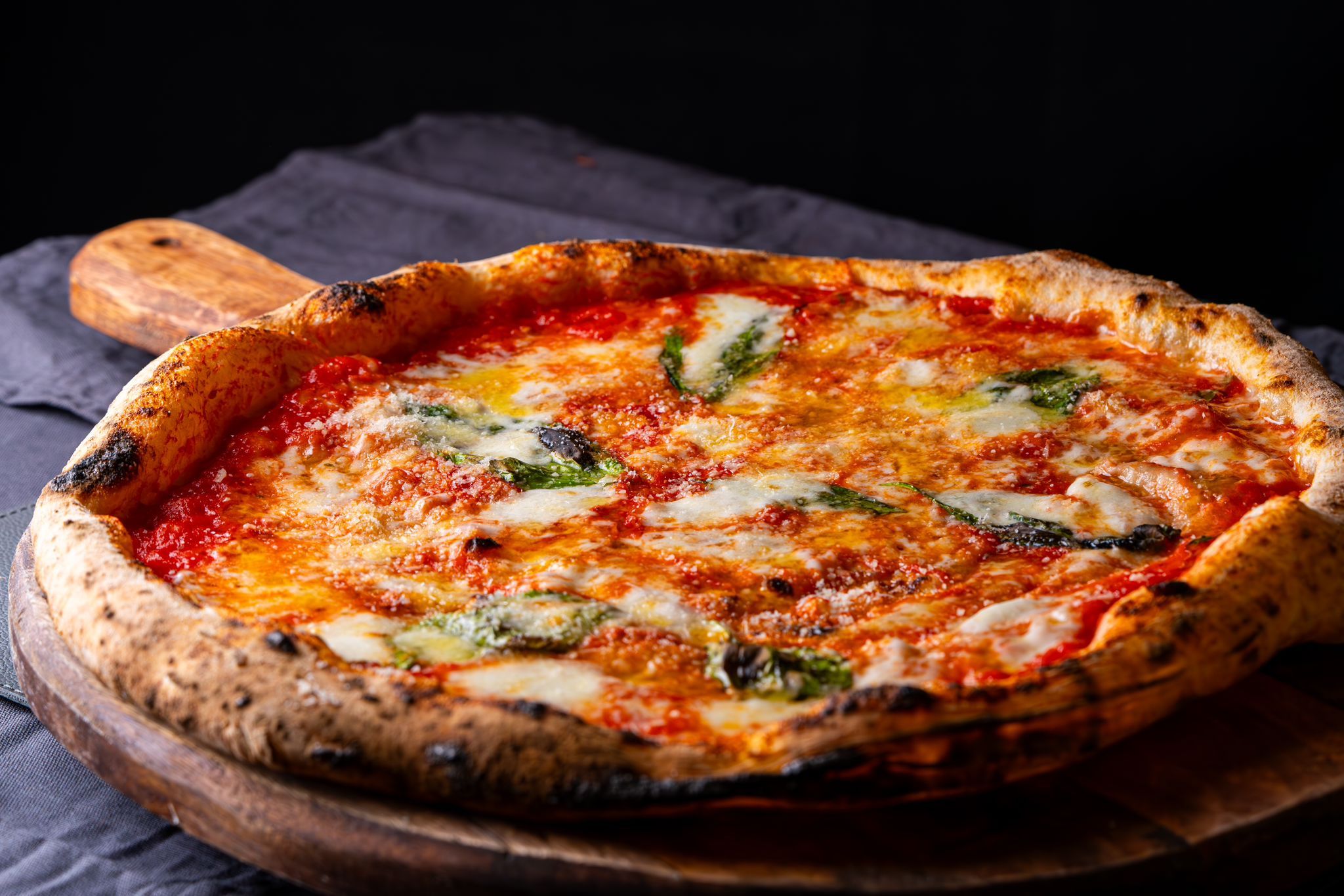 Mozzarella, tomate, champiñones, salami napolitano, jamón cocido, alcachofa, aceituna negra, aceite de oliva virgen extra y albahaca