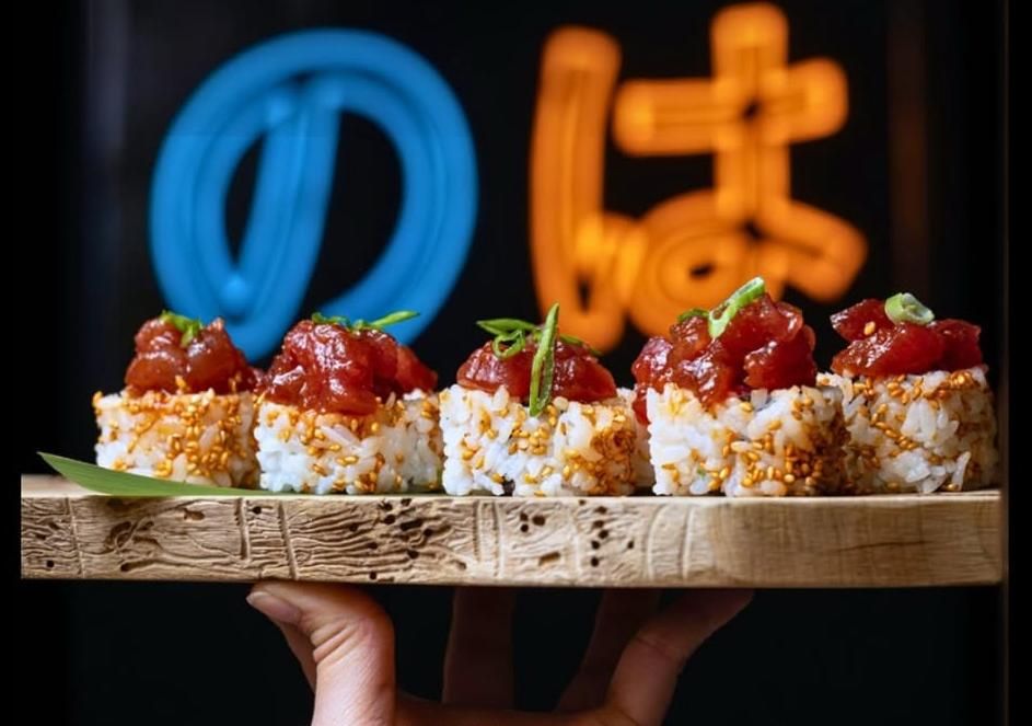 Roll de sushi innovador apostanto por nuestra piparra crujiente, atún y salsa picante y ahumada, una apuesta por el sabor nacional