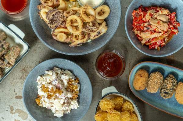 Patatas fritas con salsa brava, salsa alioli, cebolla frita, sal y perejil.