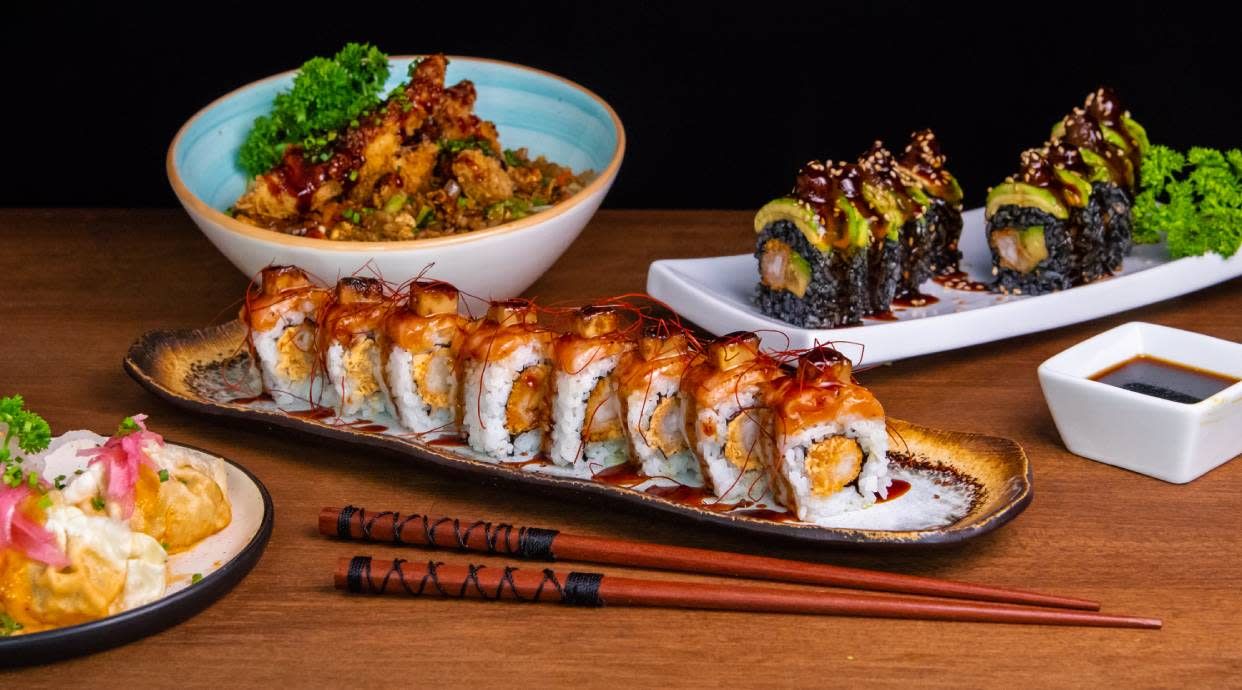 Maki de aguacate tempurizado con nuestra salsa trufada flambeada y salsa de anguila